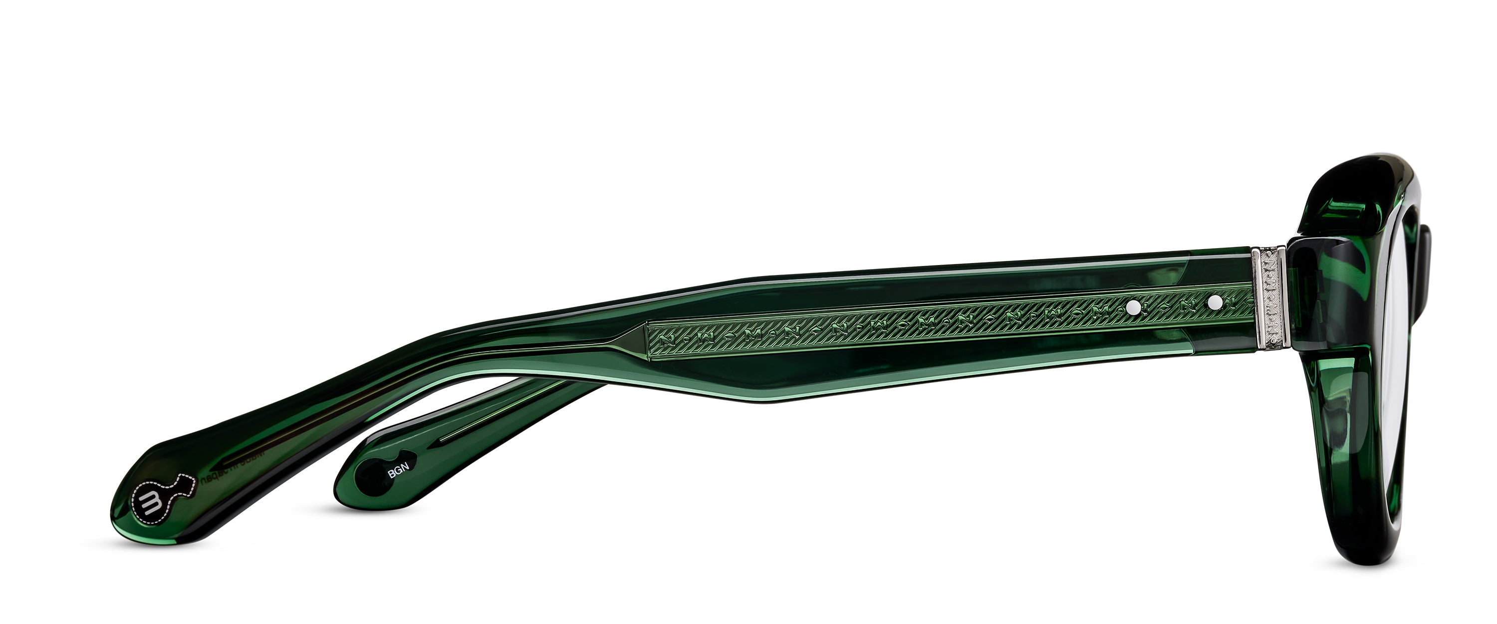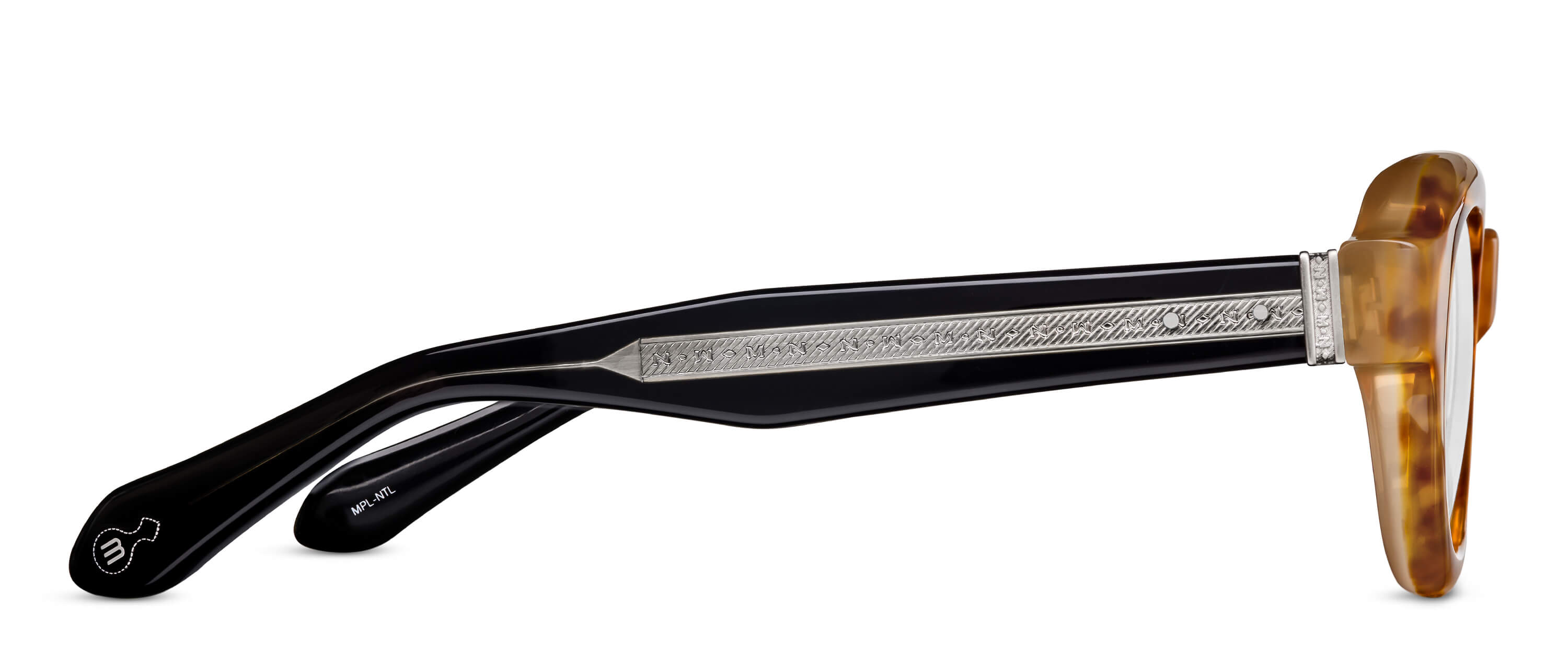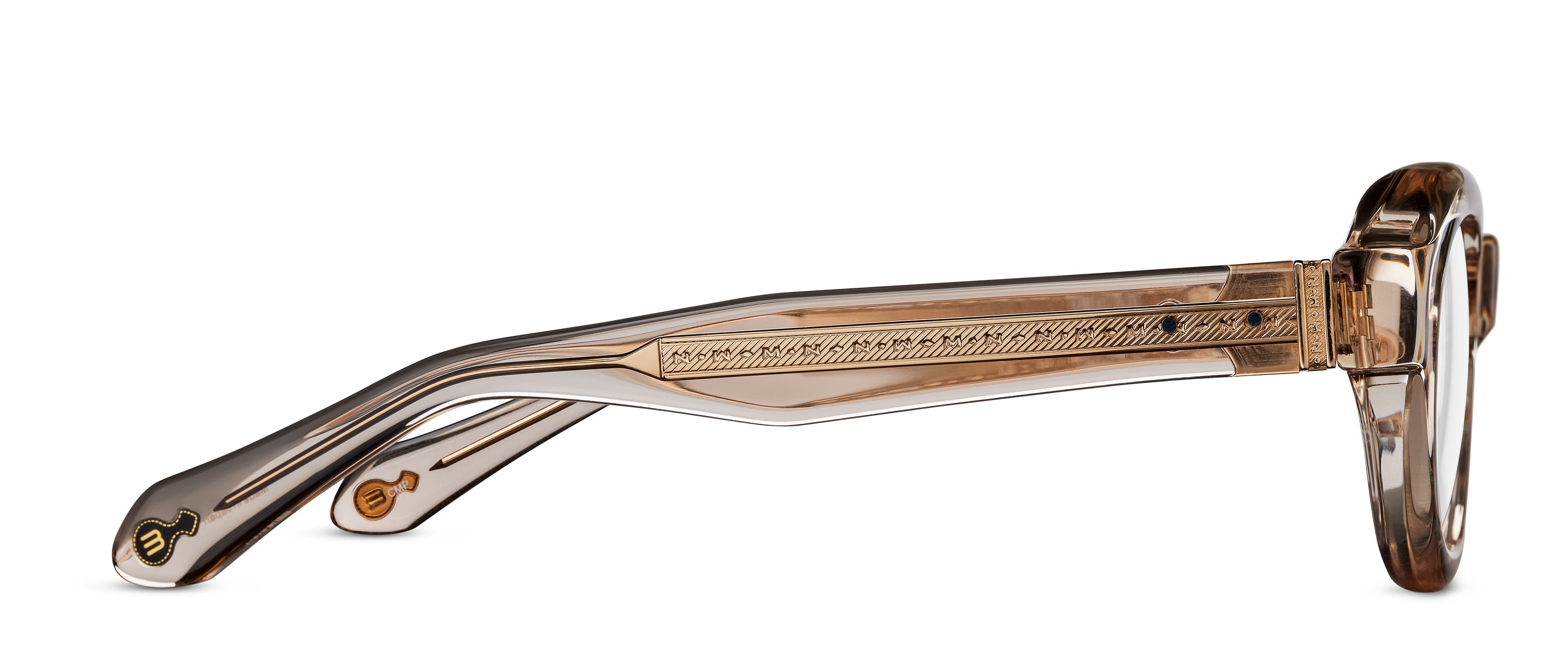 The M1028 is a robust take on a bold acetate frame. Hand sculpted Japanese Acetate is combined with precious metal hardware and custom 7 barrel hinges to create a subdued but confident look.