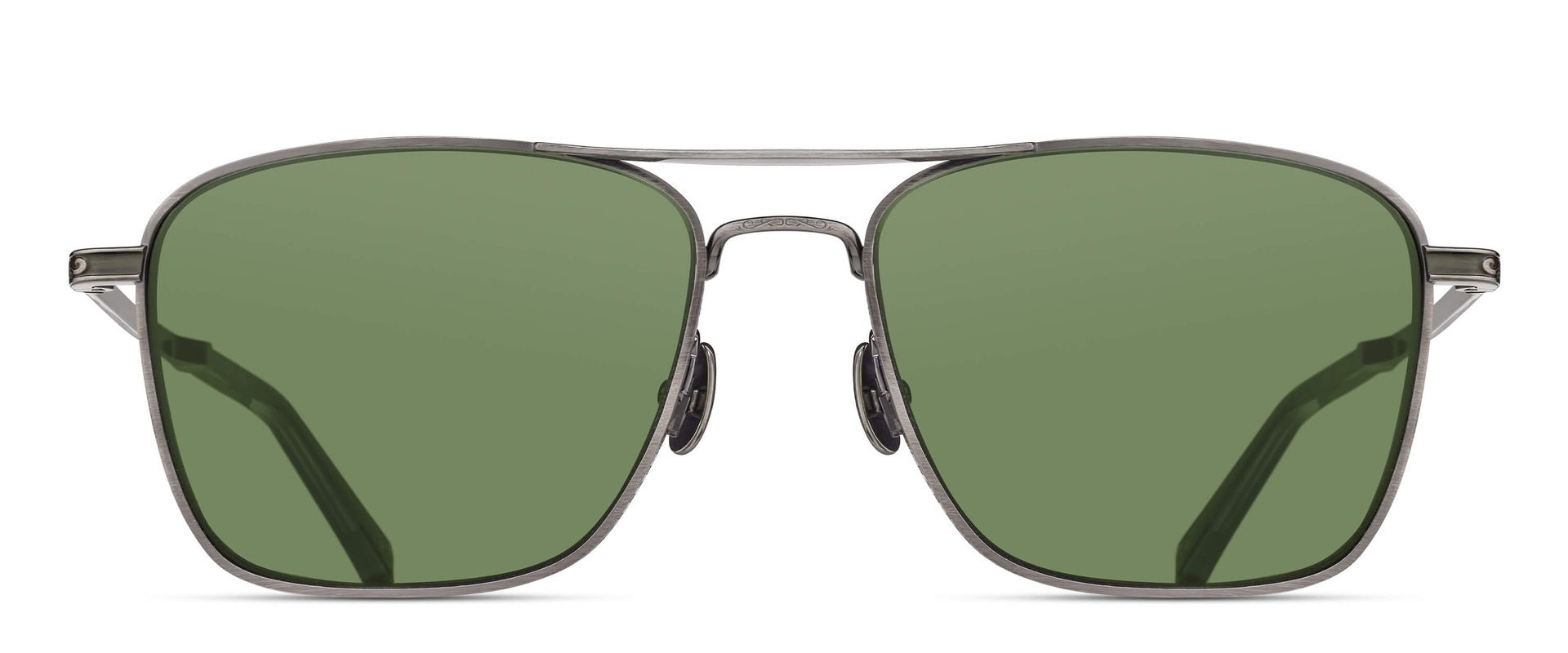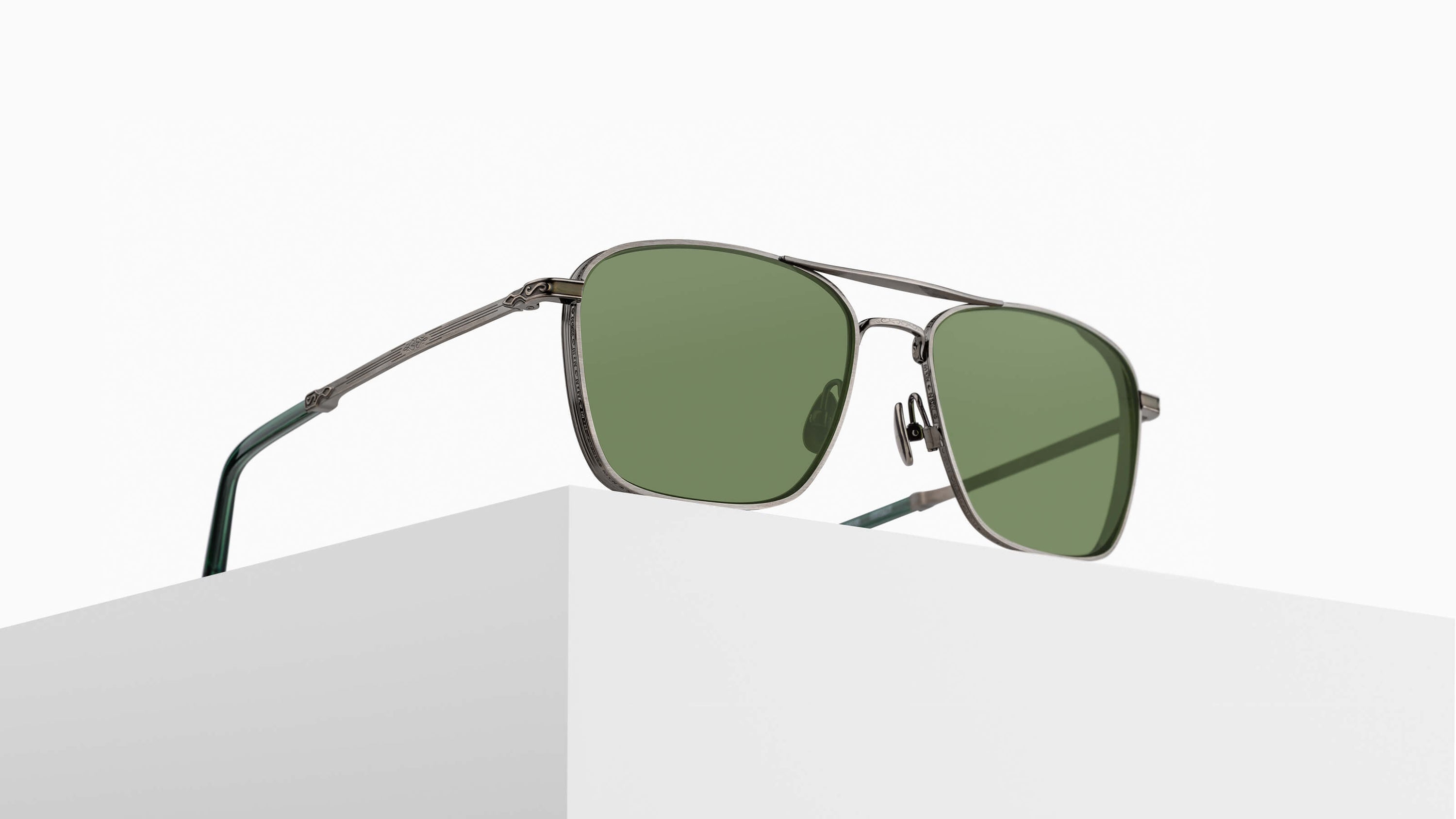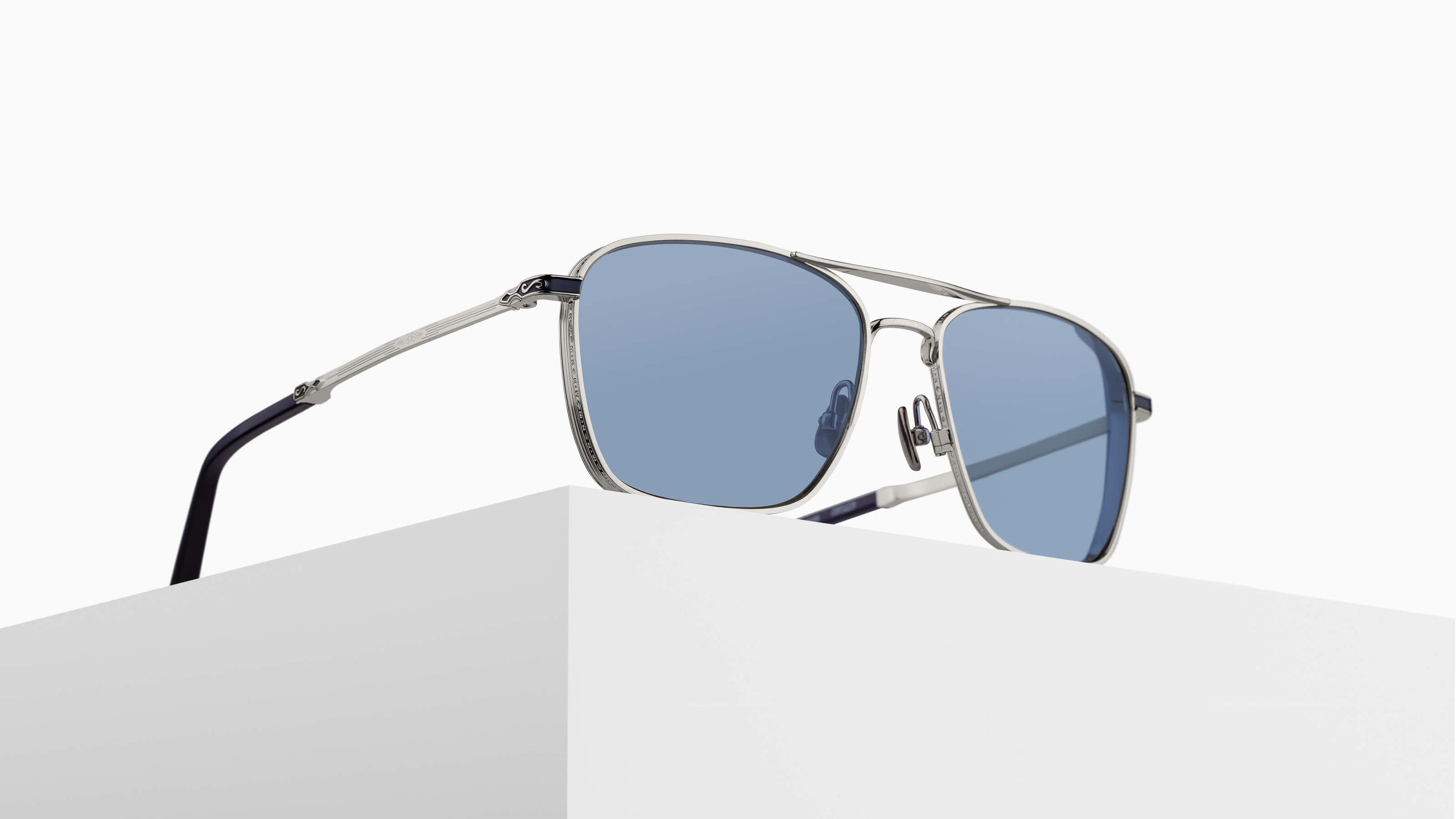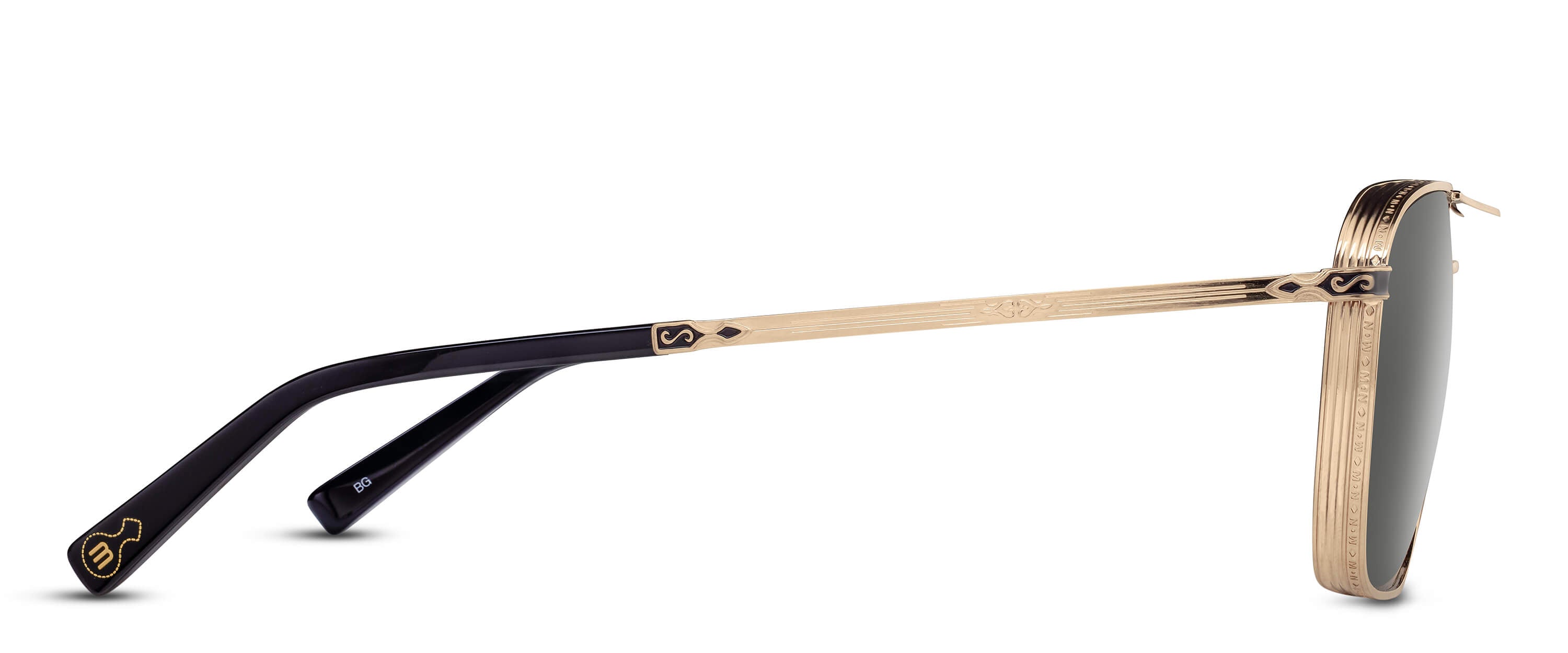 A contemporary navigator shape sunglass crafted of high-grade titanium featuring engraved temples and side-shields inspired from the art deco designs of the 1930s. The titanium construction is finished in precious metal plating complimented by hand lacquered details.