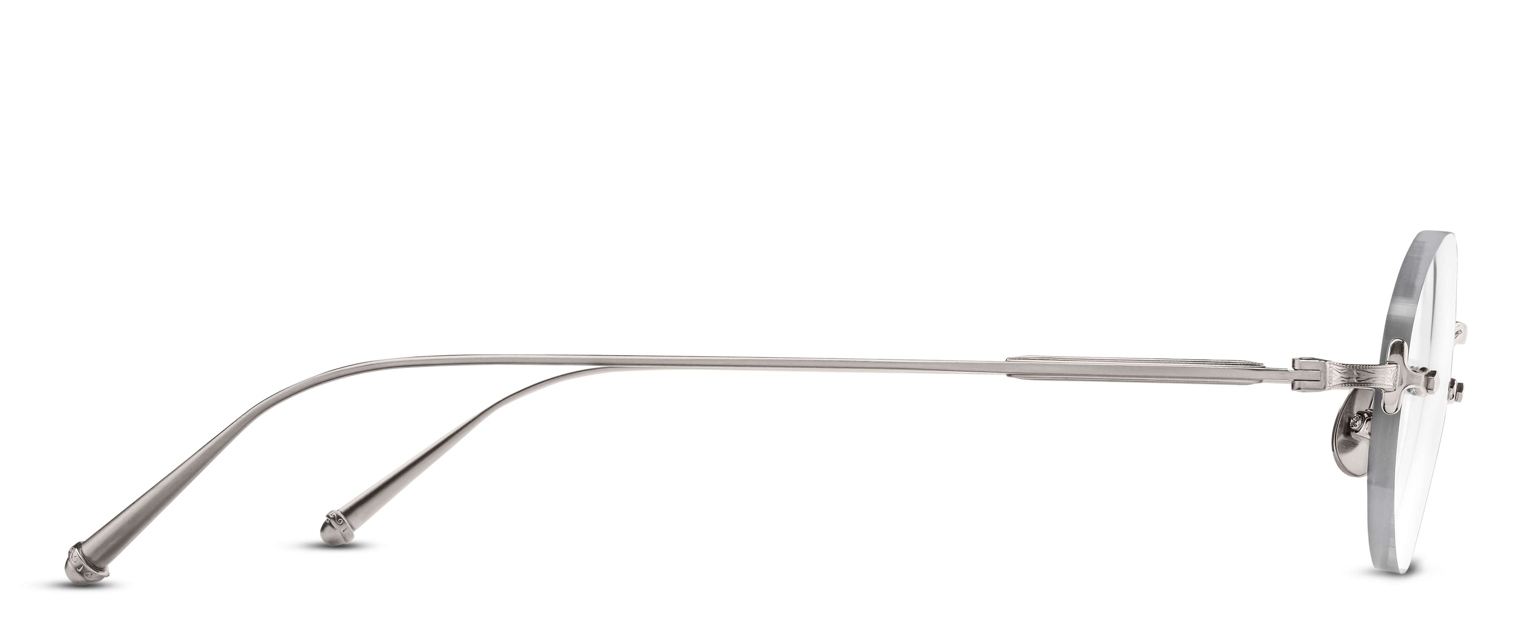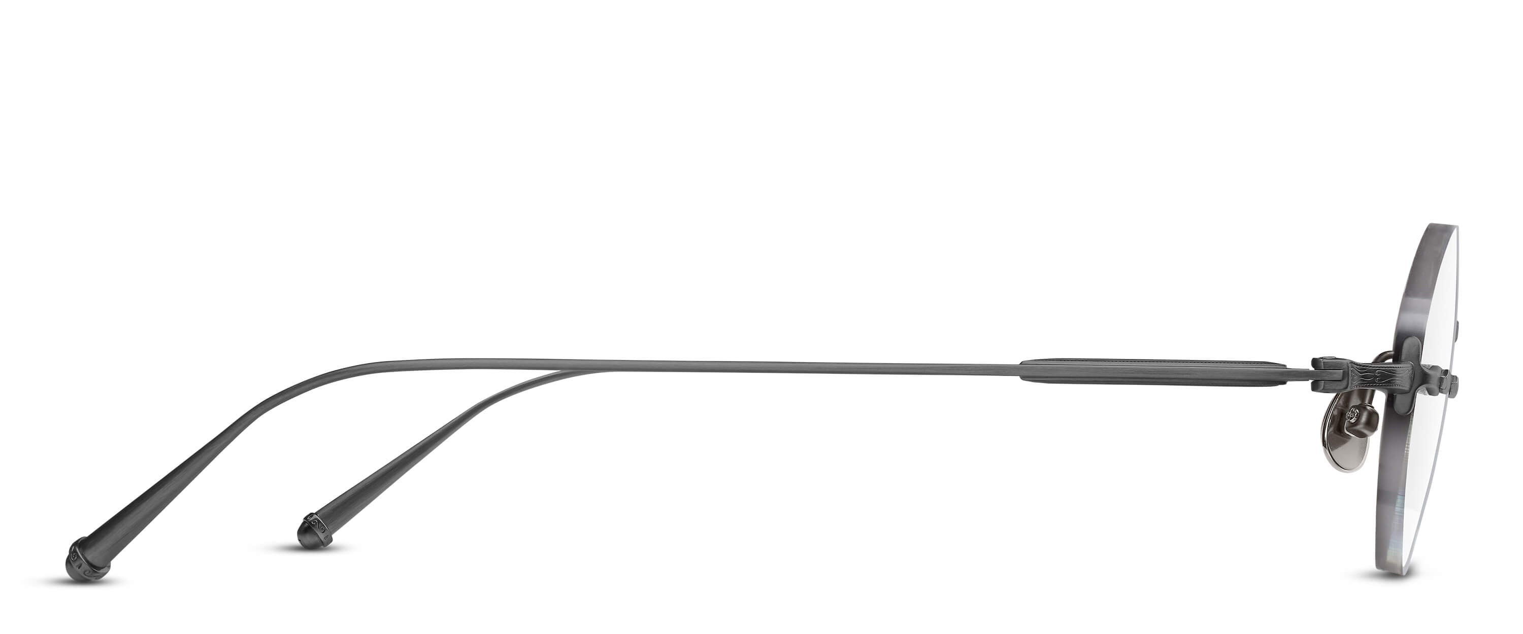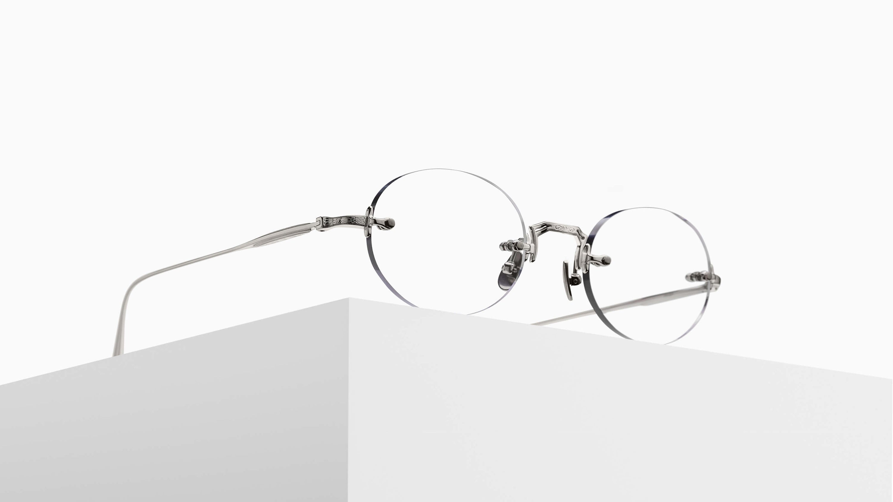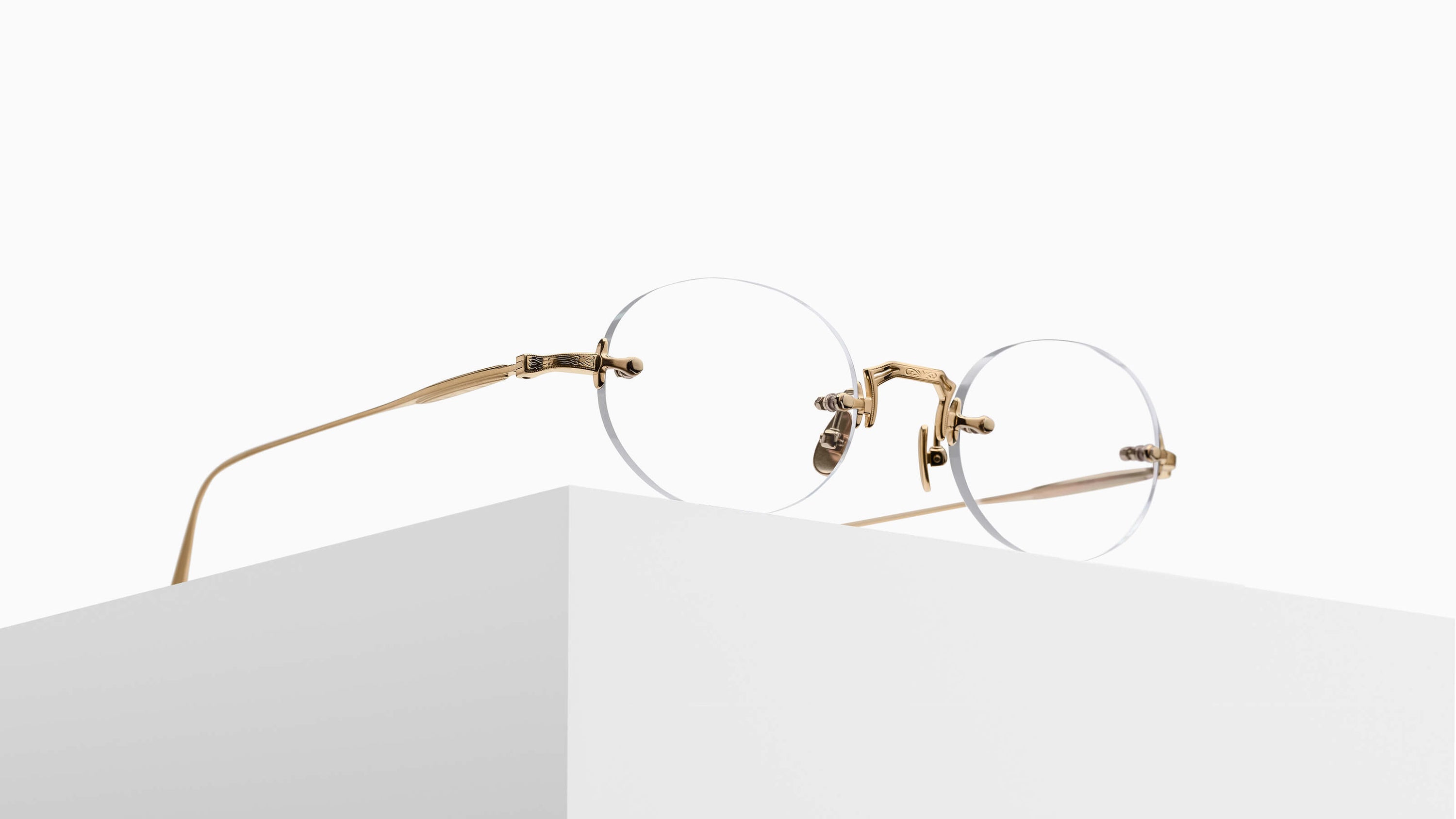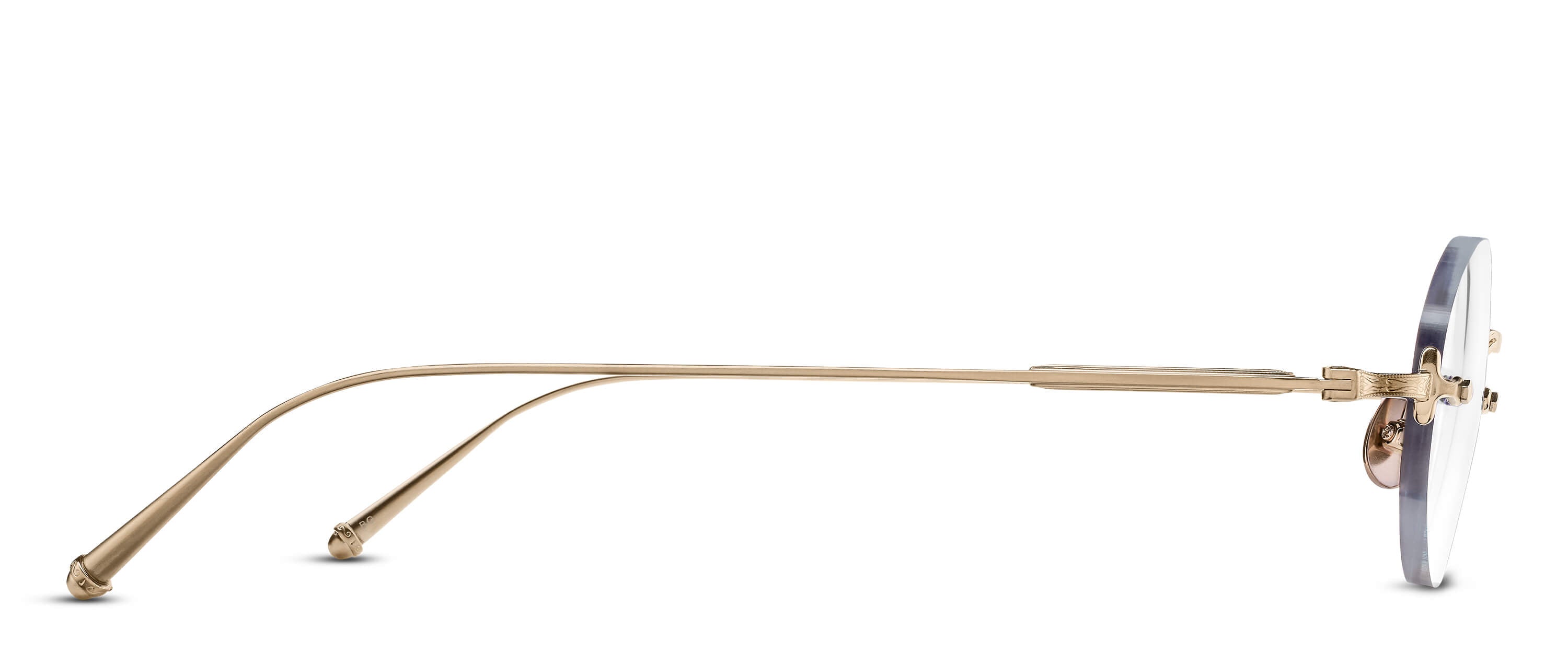 The Matsuda rimless collection reimagines classic rimless construction for today. The M5002 is a classic oval shape elegantly combined with an engraved bridge and beta Titanium temples finished in 22.5k gold and other precious metals.